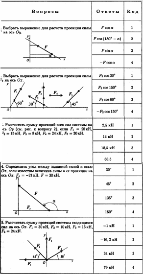 При ответе на вопросы 1 и 2 необходимо знать, что в выражение для величины проекции силы на ось подставляется угол между вектором силы и положительной полуосью координат. Не забыть, что определяется алгебраическая сумма.