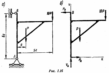 Пример 8. Для плоской рамы (рис. 1.16,а) определить опорные реакции.