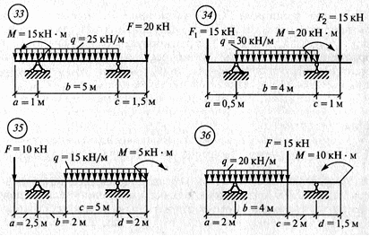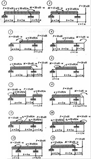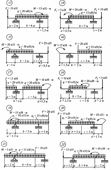 Определить опорные реакции балки на двух опорах по данным одного из вариантов, показанных на схемах. Проверить правильность их определения.