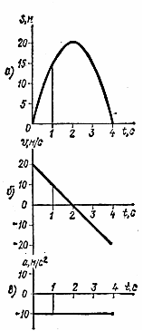 Если условно принять ускорение свободного падения g = 10 мс2 и пренебречь сопротивлением воздуха, то можно сказать, что графики описывают движение точки, брошенной вертикально вверх со скоростью а0 = 20 м/с.