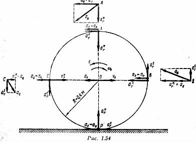 Пример 9. Железнодорожный вагон движется по горизонтальному участку с ускорением а0 = — 1,6 м/с2, имея в данный момент скорость v0 = 1 м/с. Найти ускорения точек вагонного колеса, лежащих на концах горизонтального и вертикального диаметров (рис. 1.54).