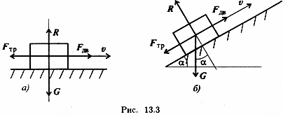 В случае движения тела по наклонной плоскости (рис. 13.3, б)