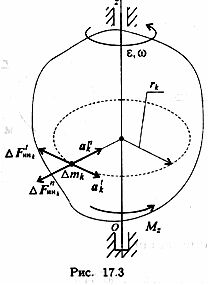 Пусть твердое тело под действием внешних сил вращается вокруг оси Oz с угловой скоростью ω (рис. 17.3).