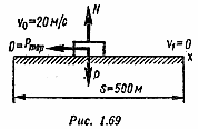 Силы, действующие на точку в произвольном положении, показаны на рис. 1.69 (Р — вес поезда, N — реакция рельсов, Ртoр — сила торможения). Для определения Ртoр применяем теорему об изменении кинетической энергии точки.