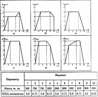Задание 1. Скорость кабины лифта массой т изменяется согласно графикам. Определить величину натяжения каната, на котором подвешен лифт, при подъеме и опускании. По максимальной величине натяжения каната определить потребную мощность электродвигателя.