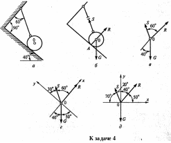 4. Выберем положение системы координат. Начало координат совмещаем с точкой 0. Ось х совмещаем с направлением линии действия реакции R, а ось у направим перпендикулярно оси х (рис. г). Определим углы между осями координат и реакциями R и S. Обычно рис. б и в не выполняют отдельно, а сразу от рис. а переходят к рис. г. Можно было ось у совместить с усилием S, и ось х направить по углом 90°, тогда решение было бы другим.
