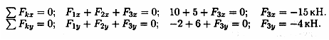 Пример 3. Система трех сил находится в равновесии. Известны проекции двух сил системы на взаимно перпендикулярные оси Ох и )у: