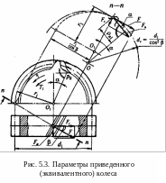 Профиль косого зуба в нормальном сечении совпадает с профилем прямого зуба тп = т. В колесах с косым зубом стандартизирован нормальный модуль. При получении формул для расчета на прочность косозубого колеса используют эквивалентное прямозубое колесо, у которого форма зуба совпадает с формой зуба в нормальном сечении косозубого колеса, радиус равен радиусу кривизны эллипса, полученного в сечении п—п зуба косозубого колеса. Эквивалентное колесо изображено на рис. 5.3.