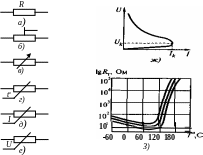 а — постоянный; б — подстроенный; в — переменный; г — терморезистор; д — позистор; е — варистор; ж — вольтамперная характеристика позистора; з — изменение сопротивления терморезистора ТРП-9 в зависимости от температуры
