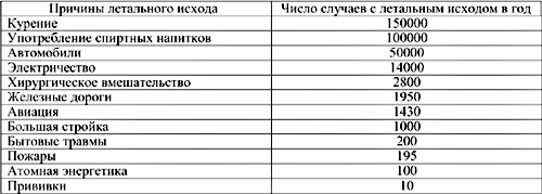 Таблица 2. Число летальных исходов в год от различных причин в США