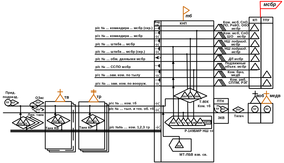 Радиосвязь командира батальона с командиром бригады обеспечивается по УКВ и KB радиосетям командира бригады, на радиостанциях Р-168-25У и Р-168-100КБ из состава командирского танка командира батальона. Радиосеть в КВ диапазоне является скрытой. В радиосетях обеспечивается маскированная телефонная связь с использованием УМТР Р-168МВ.
