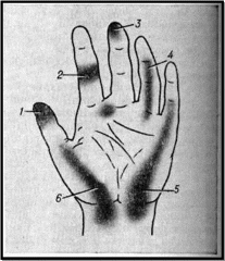 Зоны болезненности (затемнены) при гнойном воспалении пальцев кисти: