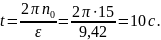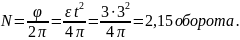 Решение. При равномерном вращательном движении имеют место следующие два уравнения: φ=φо+ωоt+εt2/2 и ω= ωо+εt. По условию ωо=0, тогда эти уравнения примут вид: φ=εt2/2 и ω = εt. Решая их и учитывая, что φ=2πN, получим окончательно ε=ω2/4πN=3,2 рад/с.