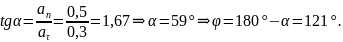 Поскольку движение автомобиля замедленное, то векторы скорости и тангенциального ускорения направлены в противоположные стороны, поэтому вектор скорости и вектор полного ускорения образуют тупой угол φ. Для нахождения этого угла определим вначале угол α, дополняющий искомый угол до 1800.