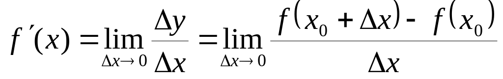 Енді Δx→0 болғанда осы қатынастың шегі бар болсын делік, ол шекті f’(x) деп белгілеп f(x) функциясының x нүктесіндегі туындысы деп атаймыз. Сонымен анықтама бойынша: