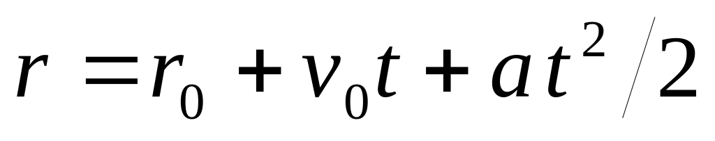 Если рассматривается прямолинейное движение, то r и F – скалярные функции. Если при этом сила – постоянная величина, то дважды проинтегрировав это уравнение и введя обозначения: a=F/m – ускорение тела, r0, v0 – положение и скорость тела в начальный момент t=0, – получим закон движения с постоянным ускорением: