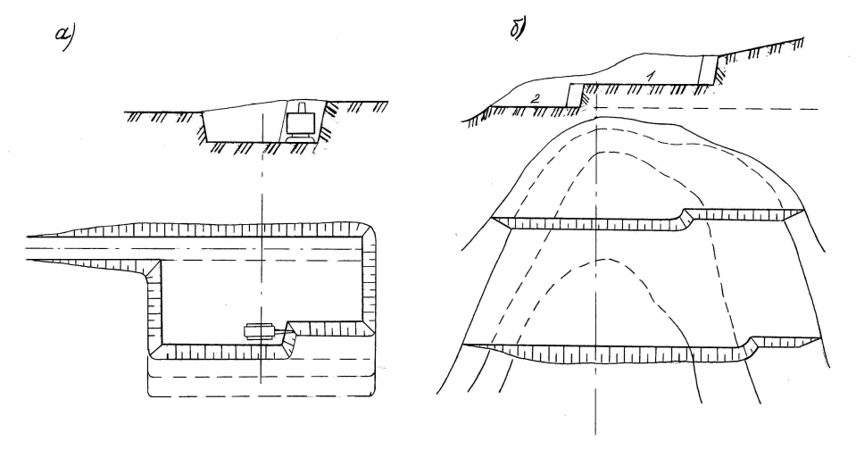 а) боковые, когда грунт выгружается в средства транспорта, стоящие сбоку от экскаватора, или, реже, в отвал, располагаемый параллельно ходу экскаватора. Боковые проходки в зависимости от уровня расположения транспорта относительно уровня стоянки экскаватора бывают одноярусные, когда транспорт располагается на одной отметке с экскаватором, и двухъярусные – при расположении на разных уровнях;