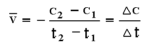 Пусть в какой–то момент времени t1 концентрация вещества А равна величине с1, а в момент t2 – величине с2. За промежуток времени от t1 до t2, изменение концентрации составит Δс = с2 – с1. Средняя скорость реакции равна: