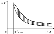 Окрім величини струму к.з., на процес і на час перегоряння плавкої вставки впливають також інші фактори: температура навколишнього середовища, значення струму режиму, що передував к.з., старіння (зношення) вставки запобіжника та ін. У зв’язку із цим характеристики запобіжників мають значний розкид характеристик, і їх необхідно зображувати у вигляді певної зони (рисунок 2.2).