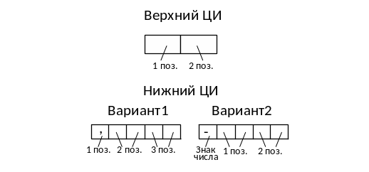 Верхний ЦИ состоит из двух позиций по две цифры. Разделение на позиции нижнего ЦИ зависит от выполняемой процедуры. Существует два варианта: в первом – выделяется 3 позиции – запятая и две позиции по две цифры; во втором варианте – знак и четыре цифры (значение сигнала, коэффициенты и т.д.).