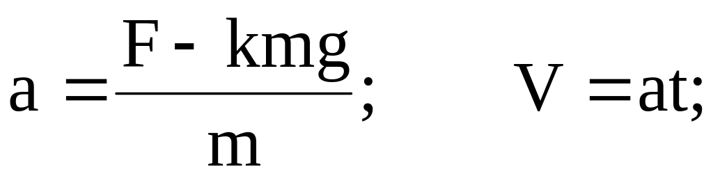 Поезд массой m трогается с места и двигается по горизонтальному пути под действием постоянной силы тяги локомотива F . Коэффициент сопротивления движению К . Определить ускорение поезда и скорость, достигнутую им через t секунд после начала движения, если