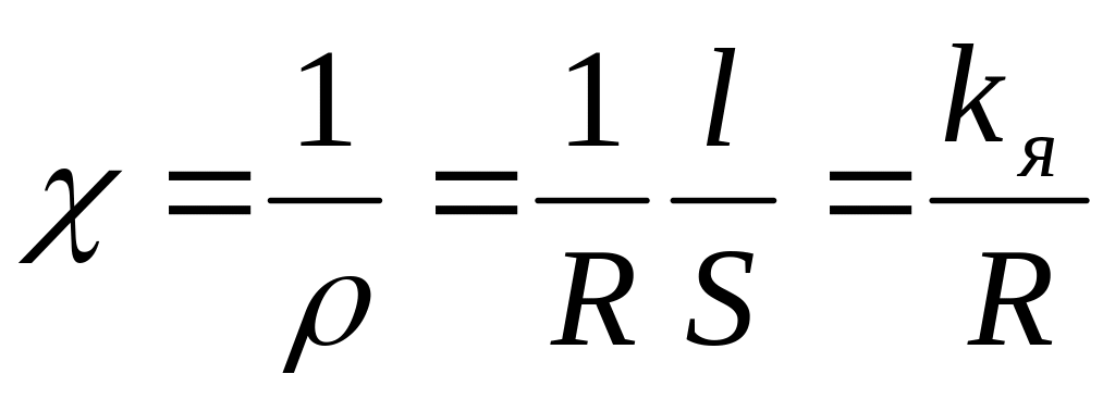 В случае l = 1 cм, S = 1 cм2, =R, т. е. удельное сопротивление это сопротивление 1 cм3 раствора. Различают удельную (χ, Ом-1×м-1) и эквивалентную (λ, Ом×см2×г-экв-1) электропроводность. Удельная электропроводность – это электрическая проводимость объема раствора, заключенного между двумя параллельными электродами, имеющими площадь по 1 м2 и расположенными на расстоянии одного метра друг от друга. Представляет собой величину, обратную удельному сопротивлению: