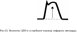 ЭКГ: В острейшей стадии (стадии повреждения, чаще всего от 20 минут до 2 часов) - в отведениях ЭКГ, записанных над областью инфаркта, - монофазная кривая: сегмент ST резко приподнят над изолинией, образует дугу, обращенную выпуклостью кверху, сливающуюся непосредственно с высоким положительным зубцом Т (рис.62).
