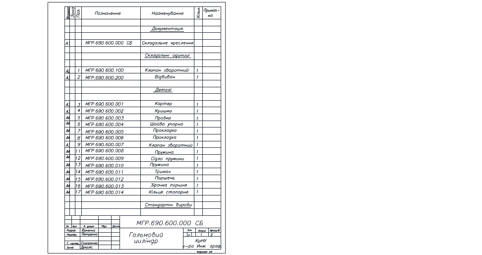 “Позначення” в розділі “Документація” – це позначення документів, що записують; у розділах “Складальні одиниці” й “Деталі” – це позначення основних конструкторських документів на них. У розділах “Стандартні вироби”, “Інші вироби”, “Матеріали” графу “Позначення не заповнюють’’;
