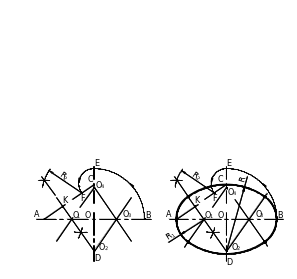 – проводим через точку K прямую перпендикулярную AF до пересечения с большой и малой осями овала в точках O1 и O2;