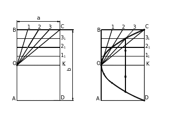 – строим прямоугольник KNDC. Сторону прямоугольника KC делим на пять равных частей, а сторону ОC на такое же число равных частей;