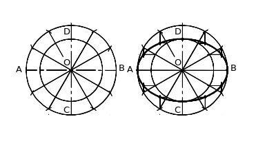 – проводим осевые линии, на которых симметрично от точки O пересечения (рисунок 3а) откладываем отрезки AB и CD, равные большой и малой осям овала;