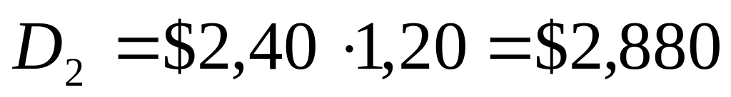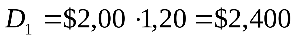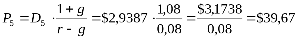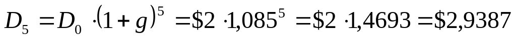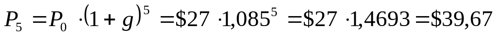 Мы могли вычислить цену через 5 лет путем вычисления дивидендов через пять лет и затем, используя модель роста дивидендов, еще раз. Другим способом является замечание, что цена акции будет увеличиваться на 5% в год, и вычисление текущей стоимости напрямую. Мы проведем вычисление обоими способами. Во-первых, дивиденды через 5 лет будут равны: