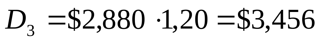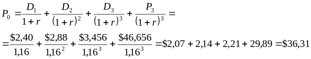 В данном сценарии мы имеем супернормальный рост в течение последующих трех лет. Нам будет нужно посчитать дивиденды в течение периода быстрого роста и цену акции через три года. Дивиденды равны: