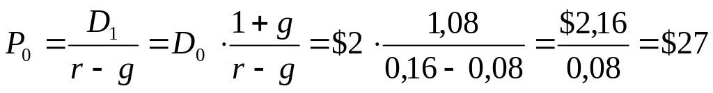 Последний дивиденд D0 был равен $2. Ожидается, что дивиденды будут равномерно расти на 8% в год. Требуемая доходность равна 16%. Используя модель роста дивидендов, получим текущую цену: