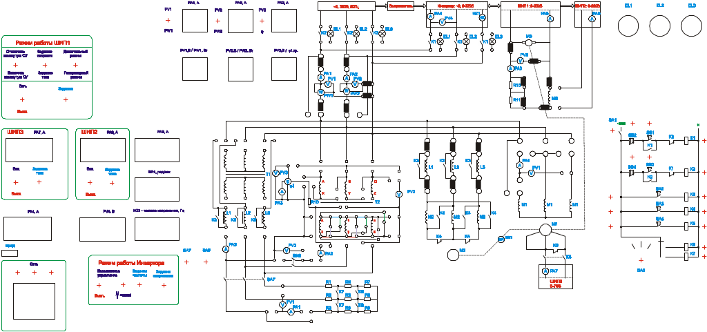 Включить режим работы ШИП1 «отключить замкнутую СУ», «включить задание скорости». Вывести рукоятку задания в крайнее левое положение. Включить ШИП1. Регулятором «Задание» ШИП1 разогнать М3 до номинальной скорости. Включить инвертор. Подобрать задание ШИП1 и задание частоты инвертора так, чтобы при ωном, ток якоря был равным нулю.
