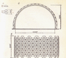 На рис. 3 наведена конструктивна схема склепіння з пластмасових пірамідальних елементів і стержневого каркасу з попередньо-напруженими алюміневими трубами.