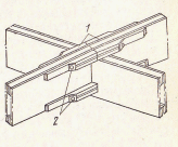 На ділянці, що дорівнює відстані між стиками двох суміжних дощок, кожну з них прикріплюють до косяків сітки цвяхами у кількості, не меншій отриманого за формулою (IX. 15). Розрахунок поздовжнього настилу ведуть на спільну дію згину від зовнішнього навантаження на проліт між косяками і на розтяг, викликаною силою Nр.