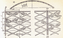 У кругло-сітчастому склепіннях всіх систем, крім клеєфанерних косяків з безшарнірним вузлом, кожний косяк працює в основному як одно прольотна балка з навантаженнями, зосередженим в середині прольоту (рис. ІХ.21).
