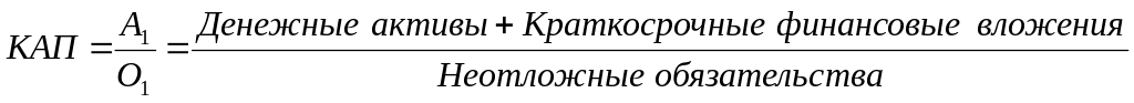 а) коефіцієнт абсолютної платоспроможності або "кислотний тест" (КАЛ). Він показує в якому ступені невідкладні зобов'язання підприємства можуть бути задоволені за рахунок наявних активів у ліквідній формі. Розрахунок цього показника проводиться по формулі: