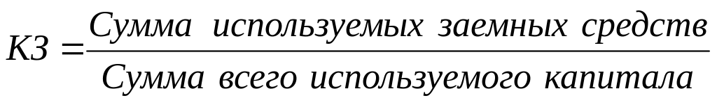 в) коефіцієнт заборгованості (КЗ). Він показує яка сума позикових засобів приходиться на одиницю усього використовуваного капіталу. Цей показник розраховується по формулі:
