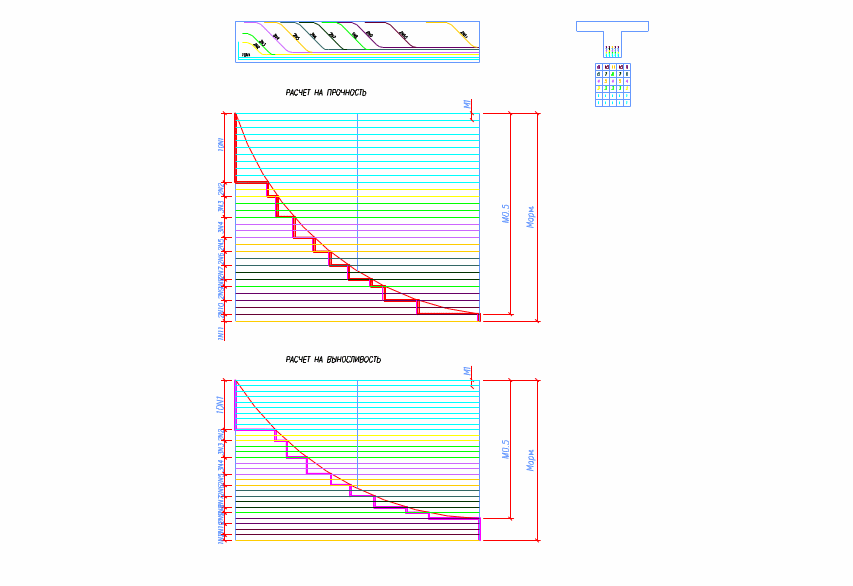 Для построения эпюры материалов разбиваем значение Марм. на 30 отрезков, каждый из которых соответствует одному стержню. Далее согласно СНиП необходимо завести 1/3 всех стержней до конца (всего 10 стержней) и загнуть под углом 900 , доводя до середины высоты. Остальные стержни загнуть. Расположение отгибов определяется по эпюре материалов, причем. согласно СНиП (п. 3.126) место начала отгибов заводим за сечение на 22 диаметра (на 66 мм) . Подробнее посмотреть расстановку отгибов можно на арматурном чертеже (см. приложение).
