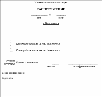 Последний пункт приказа (распоряжения) – пункт о контроле, в котором указывается наименование должности лица, ответственного за исполнение документа, его инициалы и фамилия.