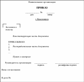 Приказы и распоряжения оформляются на общем бланке организации. Обязательными реквизитами приказа являются наименование вышестоящей организации (если она имеется), наименование организации-автора, название вида документа (ПРИКАЗ или РАСПОРЯЖЕНИЕ), дата и номер документа, место издания, заголовок к тексту, подпись, визы.
