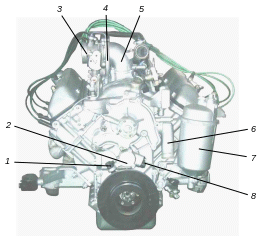 1 – впускная труба; 2 – правый топливопровод; 3– форсунки; 4 – датчик температуры воздуха (на переходном патрубке); 5 – датчик температуры охлаждающей жидкости (на впускной трубе); 6 – датчик указателя температуры охлаждающей жидкости; 7 – левый топливопровод; 8 – вакуумный шланг; 9 – регулятор давления топлива; 10 – клапан масляного радиатора; 11 – перепускной клапан масляного фильтра