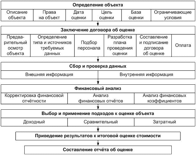 В федеральном стандарте оценки (ФСО № 1) «Общие понятия оценки, подходы и требования к проведению оценки» сказано, что проведение оценки включает следующие этапы: