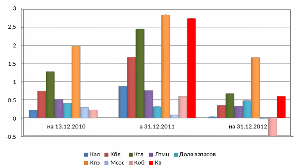 Для предприятия рассчитывается коэффициент восстановления платежеспособности, т.к. Ктл и Кос принимают значения меньше нормального ограничения. Отрицательная динамика данного коэффициента при его значении меньше 1,0 свидетельствует об отсутствии у предприятия реальной возможности восстановить свою платежеспособность в течение следующих 6 месяцев 2013 года.