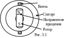 Переменное – такое напряжение, величина и направление которого периодически с определённой частотой меняются. Часто используется синусоидальный закон изменения, хотя существуют и другие формы напряжения. В общих случаях преобразования механической энергии в электрическую используются переменные напряжения. Пример самого примитивного генератора приведен на рис. 3.1.