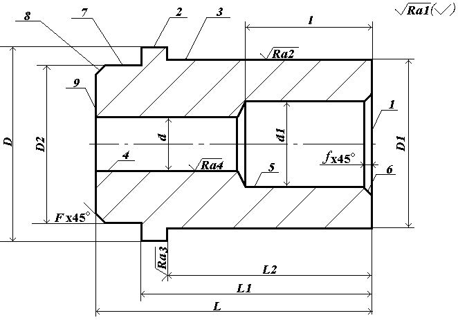 №2(наружная цилиндрическая поверхность): D, L1, Ra1 |
