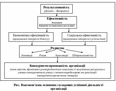 Ефективність системи управління організацією – здатність організації існувати і досягати поставлених цілей з найоптимальнішим співвідношенням результатів і витрат.