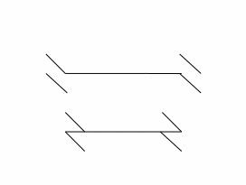 Другой вид иллюзии - вертикально-горизонтальная. Люди считают, что вертикальная линия длиннее, чем горизонтальная; на самом деле они равны (Рис. 13). Еще в одном варианте иллюзии (иллюзия «Сходящиеся рельсы») две одинаковых прямых линии, ограниченных сходящимися, наподобие железнодорожных путей, линиями, кажутся неодинаковыми. Ведь по привычным законам перспективы верхняя линия должна быть меньше, но, поскольку на самом деле обе линии одинаковы, то верхняя кажется больше (Рис. 14).